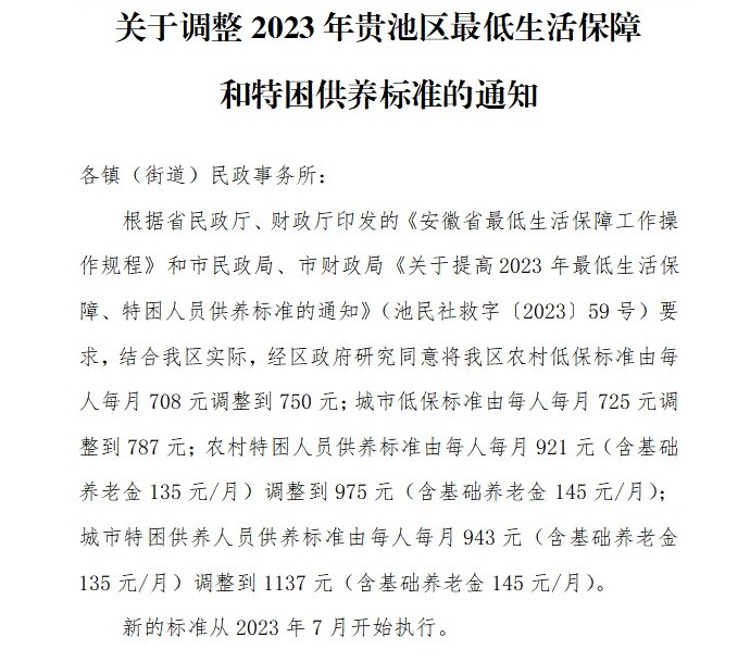 關(guān)于調(diào)整2023年貴池區(qū)最低生活保障和特困供養(yǎng)標(biāo)準(zhǔn)的通知