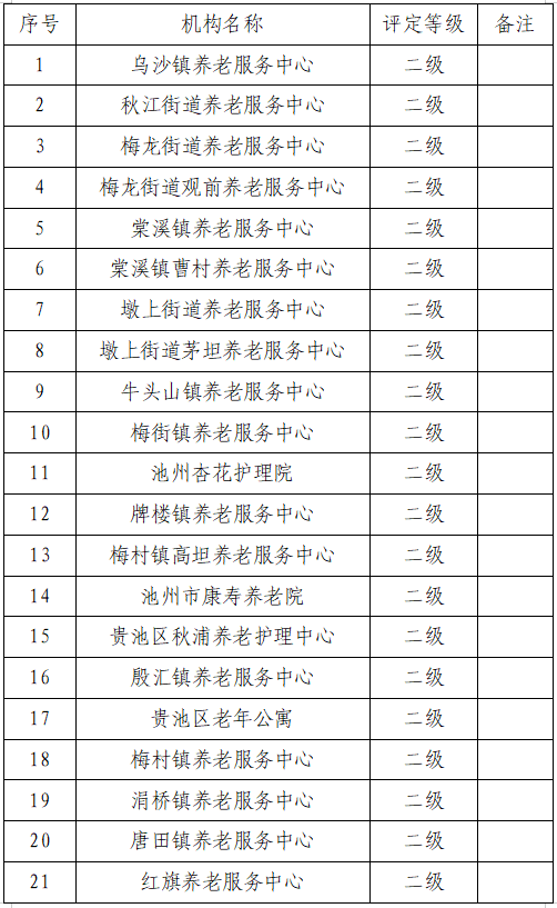 依據(jù)《養(yǎng)老機(jī)構(gòu)等級劃分與評定》國家標(biāo)準(zhǔn)實施指南(2023版),在機(jī)構(gòu)自評的基礎(chǔ)上,區(qū)民政局委托第三方評估機(jī)構(gòu)對本次申報的養(yǎng)老機(jī)構(gòu)進(jìn)行了實地復(fù)核,并對已評定的養(yǎng)老機(jī)構(gòu)進(jìn)一步復(fù)核,其中21所養(yǎng)老機(jī)構(gòu)滿足二級養(yǎng)老機(jī)構(gòu)有關(guān)條件,現(xiàn)予以公布: