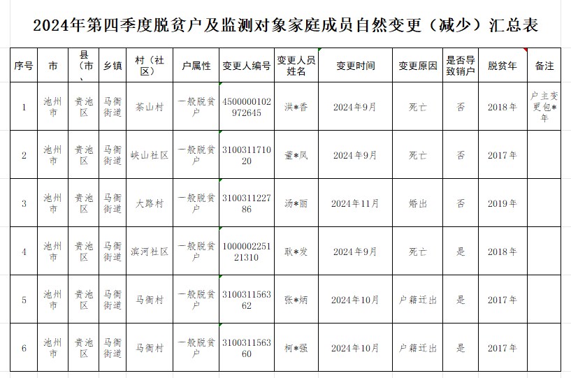馬衙街道2024年第四季度脫貧戶及監(jiān)測對象家庭成員自然變更(減少)匯總表