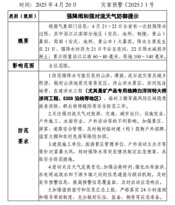 名稱: 【預警信息】貴池區(qū)應急管理局預警信息(災害預警〔2025〕1號 )強降雨和強對流天氣防御提示 文號:
