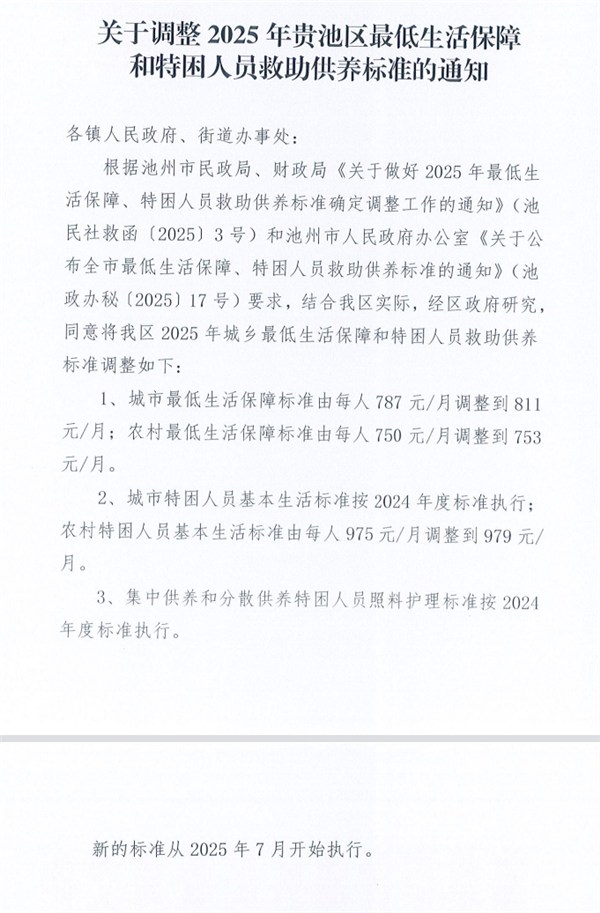 關(guān)于調(diào)整2025年貴池區(qū)最低生活保障和特困人員救助供養(yǎng)標(biāo)準(zhǔn)的通知