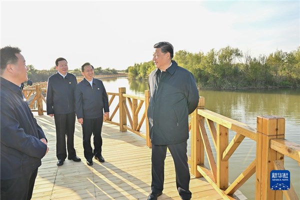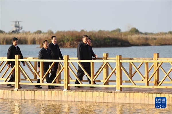 10月22日下午,中共中央總書記、國家主席、中央軍委主席習(xí)近平在山東省濟南市主持召開深入推動黃河流域生態(tài)保護和高質(zhì)量發(fā)展座談會并發(fā)表重要講話。這是座談會前,習(xí)近平20日下午在東營市黃河入??诳疾?。 新華社記者 謝環(huán)馳 攝
