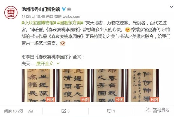 筆者從池州市秀山門博物館官微上看到,該微博運(yùn)營開始于2019年7月4日,2020年被評(píng)為文博最具潛力微博。2021年,池州市秀山門博物館微博平臺(tái)一直保持高活躍度,通過話題、視頻、活動(dòng)、直播等形式傳播文博知識(shí)、旅游攻略、時(shí)事熱點(diǎn)等,與網(wǎng)友積極交流互動(dòng)。截至目前,該官微擁有34.8萬粉絲,視頻累計(jì)播放量54萬。