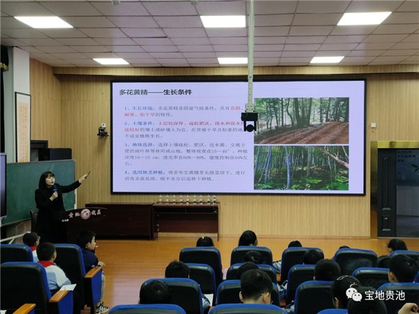 “民間有句話叫‘北有長白人參,南有地藏黃精’,而受九華山脈的地理、氣候滋潤生長除了的扁葉姜形黃精,品質(zhì)最佳……”近日,貴池區(qū)城關(guān)小學(xué)的階梯教室里,正在上著一場生動(dòng)有趣的植物科普講座。主講老師介紹著黃精的功效和生長條件,配合著圖片和不同蒸曬階段的黃精實(shí)物,將一顆黃精的“蛻變”之旅娓娓道來。
