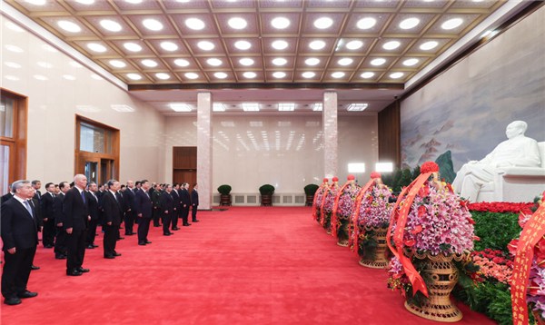 12月26日,中共中央在北京人民大會(huì)堂舉行紀(jì)念毛澤東同志誕辰130周年座談會(huì)。座談會(huì)前,習(xí)近平、李強(qiáng)、趙樂際、王滬寧、蔡奇、丁薛祥、李希、韓正等領(lǐng)導(dǎo)同志來到毛主席紀(jì)念堂瞻仰毛澤東同志遺容。新華社記者 鞠鵬 攝