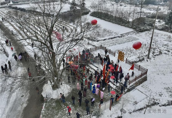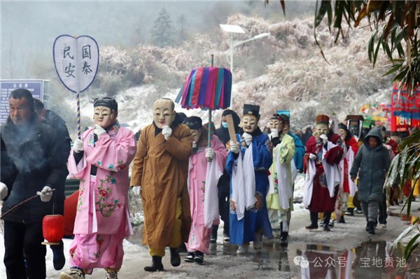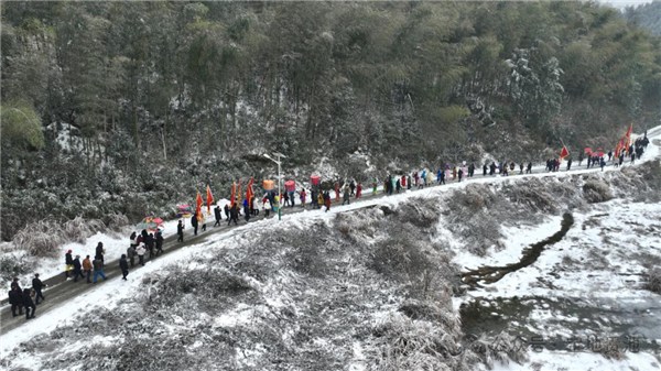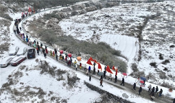一時(shí),旗傘如林,鑼鼓喧天,浩浩蕩蕩的巡游隊(duì)伍如長(zhǎng)龍般蜿蜒在被潔白外衣覆蓋的山間小道上,神秘而壯觀。