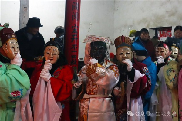 待各執(zhí)事人及參與儺儀表演的人員齊聚祠堂,村中老一輩便會(huì)為今年參演的小輩裝扮。穿戲衣、扎頭巾、向儺神捐拜后再戴上面具……鳴鑼三遍后,整裝待發(fā)的“神隊(duì)”便開始沿著古老的路線“踩村”,村民圍繞在隊(duì)伍兩旁一起哄搶傘上的燈籠,祈盼新年好運(yùn)久久。