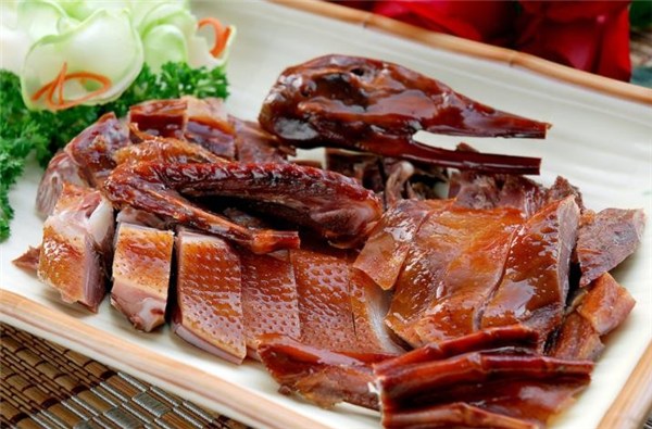 阮橋板鴨采用當(dāng)?shù)仄贩N鴨即“齊毛鴨”為原料。每年開春育苗飼養(yǎng),立冬時(shí)宰殺,經(jīng)過祖?zhèn)鞴に囯缰埔粋€(gè)月以上,再自然風(fēng)干。歷經(jīng)20余道工序的阮橋板鴨具有“干、板、酥、香”的特點(diǎn),外觀飽滿,體肥皮白,肉質(zhì)細(xì)嫩緊密。食用時(shí)蒸、煮、煲皆可,口感勁道,肥而不膩,松嫩可口,咸淡適中,味道鮮醇,回味無窮。當(dāng)?shù)氐娜顦虬屮啛趵宵S豆是一道經(jīng)典的傳統(tǒng)菜肴。