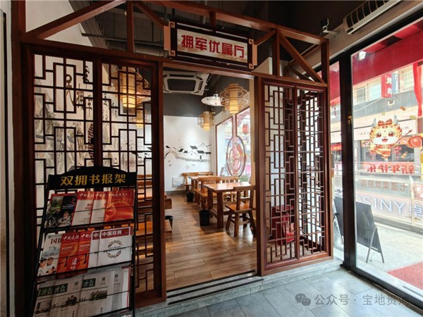 進門右手邊有一個“特別定制”的擁軍優(yōu)屬廳,而在該餐館的入口處、吧臺旁、餐桌上都有清晰寫著“擁軍優(yōu)屬”優(yōu)惠內(nèi)容的海報或桌牌。此時店里人滿為患,升騰起的“熱乎氣”不僅有城市煙火,還有擁軍愛國的濃厚情誼。