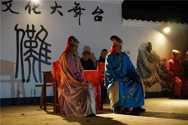 每當(dāng)演出那天,連理樹(shù)下彩旗飄揚(yáng),鑼鼓喧天,鞭炮齊鳴,儺舞粗獷。戴儺面具的“皇帝”執(zhí)傘和“土地神”執(zhí)古老錢鏗鏘對(duì)舞,表達(dá)著天地交融、陰陽(yáng)結(jié)合、潤(rùn)生萬(wàn)物。屆時(shí),龍?zhí)督鸫蹇谒泥l(xiāng)八鄰,千人涌動(dòng),觀者如潮。