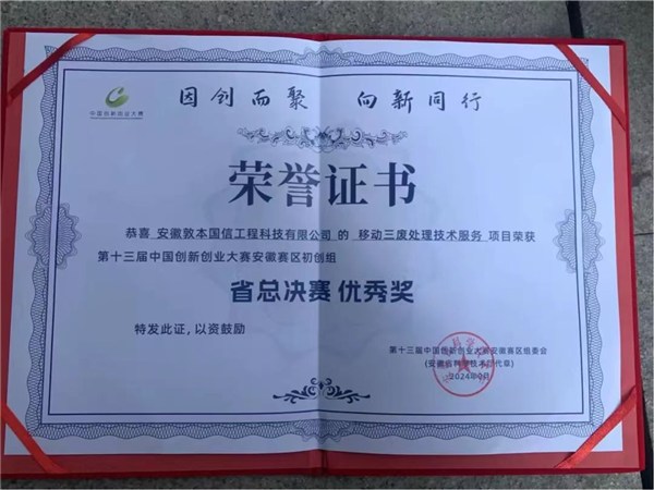 在近期舉行的中國(guó)創(chuàng)新創(chuàng)業(yè)大賽安徽省賽中,池州高新區(qū)企業(yè)安徽敦本國(guó)信工程科技有限公司憑借技術(shù)領(lǐng)先的創(chuàng)新成果——移動(dòng)式三廢處理設(shè)施項(xiàng)目從省賽決賽的12家初創(chuàng)組企業(yè)中脫穎而出獲得優(yōu)秀獎(jiǎng)。