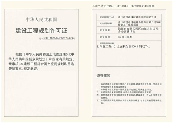 池州市貴池區(qū)融峰新能源有限公司1GWh儲能工廠建設(shè)項(xiàng)目建設(shè)工程規(guī)劃許可證公示