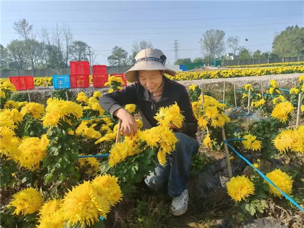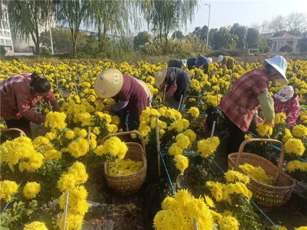 趁著晴好天氣,村民們正在搶摘成熟的花朵,搬運、分揀運輸,一片繁忙的豐收景象。鋪滿田間的菊花不僅成為牛頭山村一道美麗的風(fēng)景線,更為周邊農(nóng)戶增添了務(wù)工增收的好機會。
