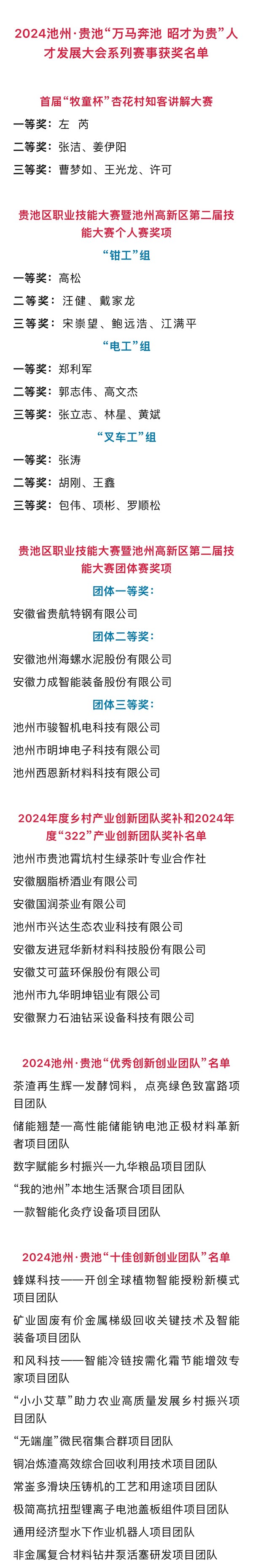 12月20日,2024池州?貴池“萬(wàn)馬奔池 昭才為貴”人才發(fā)展大會(huì)正式閉幕。區(qū)委副書(shū)記、區(qū)長(zhǎng)錢松出席大會(huì)并宣布大會(huì)閉幕。區(qū)委副書(shū)記張煥,區(qū)領(lǐng)導(dǎo)裴鈞、汪賽榮、張亮、胡燦熔、桂濤及相關(guān)園區(qū)負(fù)責(zé)同志,池州學(xué)院、池州職業(yè)技術(shù)學(xué)院相關(guān)負(fù)責(zé)同志出席活動(dòng),并為在2024池州?貴池“十佳創(chuàng)新創(chuàng)業(yè)團(tuán)隊(duì)”選拔大賽決賽、2024年貴池區(qū)職業(yè)技能大賽暨池州高新區(qū)第二屆技能大賽等系列賽事中取得優(yōu)異成績(jī)的團(tuán)隊(duì)和個(gè)人頒獎(jiǎng)。