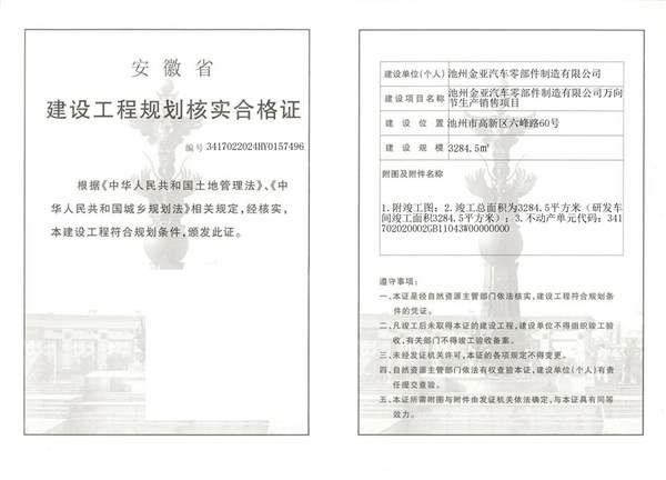 池州金亞汽車零部件制造有限公司萬向節(jié)生產(chǎn)銷售項目(研發(fā)車間)建設(shè)工程規(guī)劃核實合格證公示