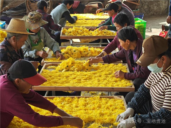圖為在牛頭山村菊花烘干廠內(nèi),村民忙著挑揀菊花