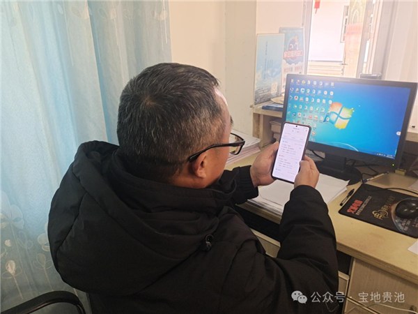 圖為姥山社區(qū)干部正在手機后臺查看智能門磁系統(tǒng)