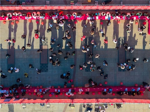 2025年1月15日,求職者在招聘會現場了解招聘信息(無人機照片)。新華社發(fā)(阮雪楓攝)