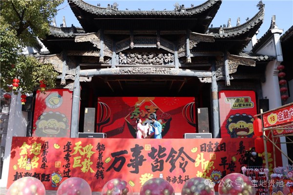 “秀小吉廟會大集正式開始啦,接下來將為大家?guī)砭时硌荨睆V場內(nèi)最深處的古戲臺上,《天仙配》《花開花放》《天女散花》……一出出悠揚動聽的黃梅戲接連登場。在淳樸流暢、賞心悅目的表演中,節(jié)日的喜慶和傳統(tǒng)文化的氛圍愈發(fā)濃厚。