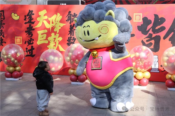秀山門博物館內(nèi)廣場里,是熱熱鬧鬧的市集區(qū)。正門處,一只巨大的“秀小吉”就坐在這里,迎接著來往游客。市集內(nèi)總共分為三個區(qū)域:進(jìn)門便是“口?!眳^(qū),章魚小丸子、肉卷餅等小商鋪內(nèi)琳瑯滿目,散發(fā)誘人香氣;祈福區(qū)里,祈福亭上掛著紅燈籠和福牌,游客們在此駐足,為來年平安順?biāo)炱砀#患{福區(qū)里,則是剪紙、漆扇等非遺文化的手作,營造了濃厚的中國傳統(tǒng)文化氛圍。