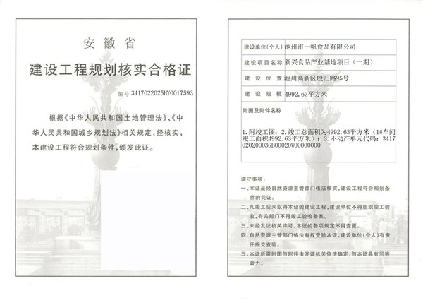 池州市一帆食品有限公司1#車間建設(shè)工程規(guī)劃核實合格證公示