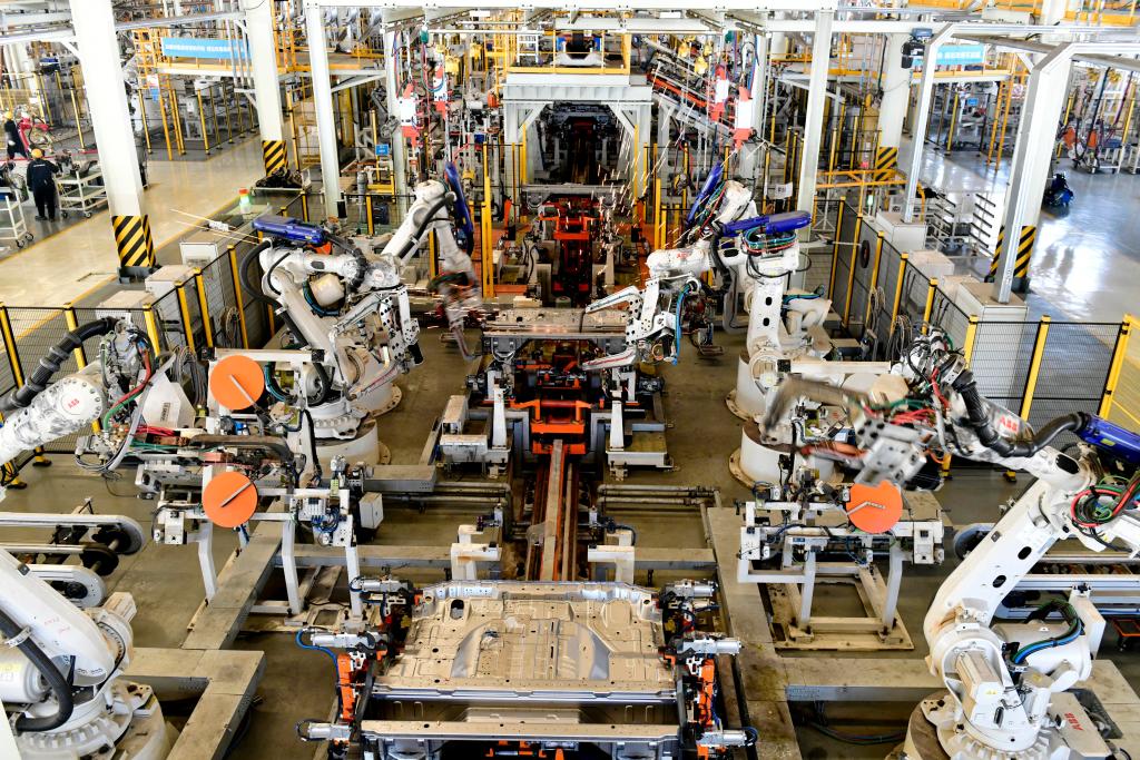 1月9日,在位于日照市五蓮縣的五征集團汽車焊裝車間,工業(yè)機器人在焊裝車身。新華社記者郭緒雷攝