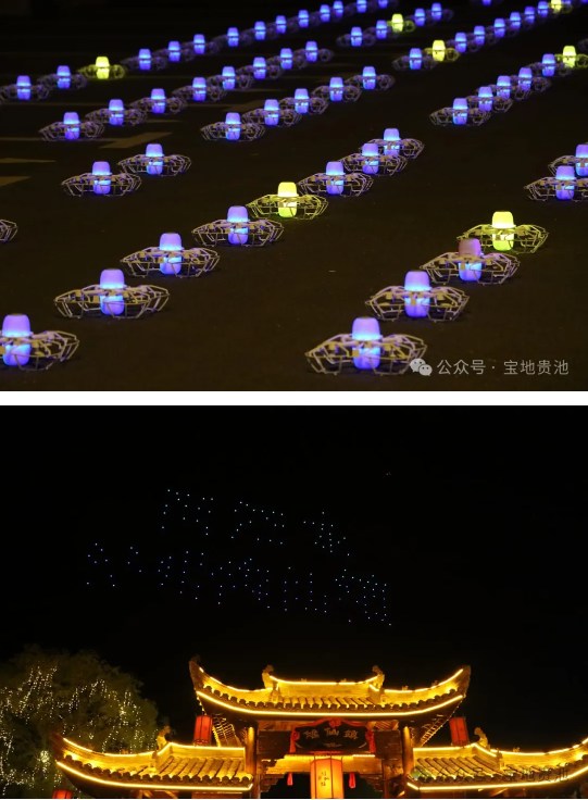 4月15日晚,九華天池儺仙鎮(zhèn)景區(qū)迎來了一場科技與文化的“不夜”盛宴,數(shù)百架無人機騰空而起,以天為幕,以光為筆,在夜空中編織出璀璨的圖案。這場融合了非遺傳承與現(xiàn)代科技的大秀,既展現(xiàn)了山水古鎮(zhèn)的煥新活力,同時也為游客與市民獻上一場“古今碰撞”的視聽奇觀。