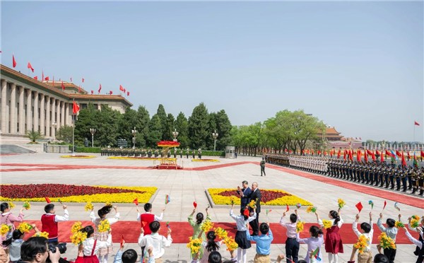 4月23日上午,國家主席習近平在北京人民大會堂同來華進行國事訪問的阿塞拜疆總統(tǒng)阿利耶夫舉行會談。這是會談前,習近平在人民大會堂東門外廣場為阿利耶夫舉行歡迎儀式。新華社記者 翟健嵐 攝