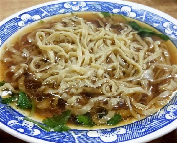 小刀面制作要放幾個(gè)小時(shí)才能用,用大面皮壓實(shí)后用刀裁切成細(xì)細(xì)的條,裁切出來(lái)面條個(gè)個(gè)有銅絲的粗細(xì),甩進(jìn)大鍋里用滾水翻煮,再小心挑進(jìn)碗里,搭配多年的特制“底料”。有的食客要加上幾片牛肉,或加一塊炸至兩面金黃的荷包蛋,愛(ài)吃辣再加一勺辣醬,口水怎么也止不住了。