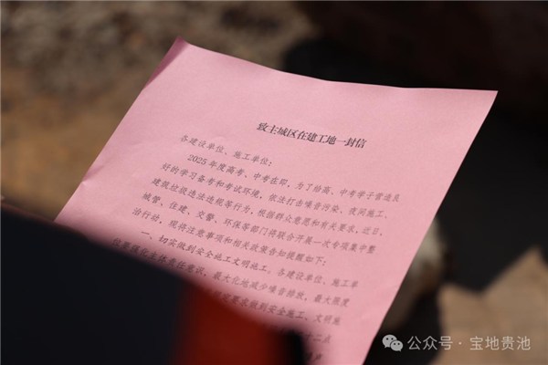 執(zhí)法過程中,普法宣傳貫穿始終。執(zhí)法人員手把手指導工人規(guī)范遮蓋建材,協(xié)助施工方優(yōu)化車輛清洗動線,主動向運輸企業(yè)、施工方和從業(yè)人員發(fā)放宣傳資料,普及建筑垃圾管理的法律法規(guī),以促進其自覺遵守規(guī)定。水電八局池州市人民醫(yī)院地下停車場項目負責人王源輝在執(zhí)法人員的引導下,正和同事仔細閱讀當天發(fā)放的《致主城區(qū)在建工地一封信》,他說:“執(zhí)法人員提醒我們,馬上要高中考了,要給廣大考生營造良好的考試環(huán)境。我們工地接下來將在降噪方面加大管理力度,選用低噪聲施工設備,合理安排施工時間,同時在臨近居民區(qū)一側(cè)設置隔音屏障,最大程度降低施工噪聲對周邊環(huán)境的影響。”