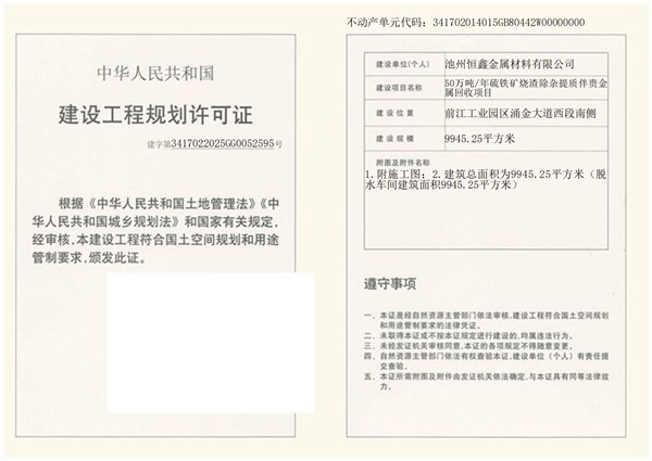 池州恒鑫金屬材料有限公司50萬噸/年硫鐵礦燒渣除雜提質(zhì)伴貴金屬回收項目建設(shè)工程規(guī)劃許可證公示