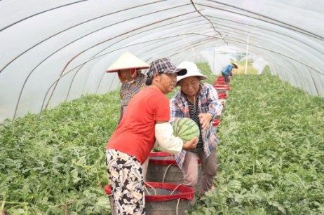 采訪當(dāng)天,多名瓜農(nóng)正在大棚內(nèi)彎腰輕拍西瓜,通過聲響判斷成熟度,隨后麻利地采摘、裝筐、搬運(yùn)裝車。正在忙碌的新義村村民陳潤(rùn)紅笑著說:“從3月西瓜授粉開始,老板便經(jīng)常請(qǐng)我們過來做工,每天工錢80多元,既不耽誤自家農(nóng)活,還能多份收入!”像她這樣實(shí)現(xiàn)家門口就業(yè)的周邊村民,基地已吸納60余人,人均年增收近2萬元。