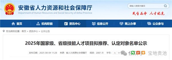 8月4日,安徽省人社廳公示2025年國家級、省級技能人才項目擬推薦、認定對象名單,內(nèi)容如下: