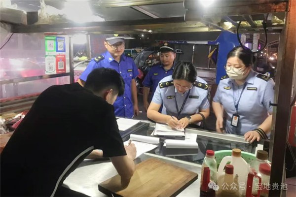 “老板,健康證可別‘藏’起來(lái),要掛在顯眼的地方,讓消費(fèi)者一目了然?!薄澳?!請(qǐng)問(wèn)肉串的原料是從哪家供應(yīng)商進(jìn)的?麻煩出示一下供貨者的許可證和產(chǎn)品合格證明?!薄?月28日晚,主城區(qū)通達(dá)廣場(chǎng)人聲鼎沸,記者跟隨區(qū)市場(chǎng)監(jiān)管局城關(guān)市場(chǎng)監(jiān)管所工作人員的腳步穿梭于煙火繚繞的攤位間,對(duì)各個(gè)攤位開(kāi)展夜間“錯(cuò)時(shí)監(jiān)管”,一查健康證明,看健康證辦理情況;二查食材來(lái)源,看進(jìn)貨查驗(yàn)記錄;三查加工操作,看衛(wèi)生規(guī)范執(zhí)行情況,直擊食品安全隱患核心。