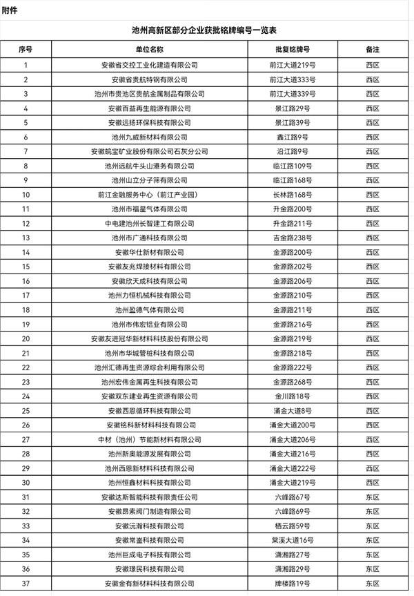 附件:池州高新區(qū)部分企業(yè)獲批銘牌編號一覽表