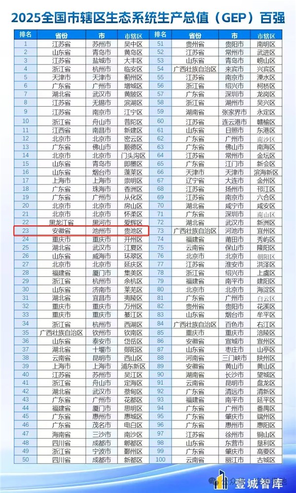 近日,《中國(guó)縣域/市轄區(qū)生態(tài)系統(tǒng)生產(chǎn)總值(GEP)研究報(bào)告2025》正式發(fā)布,揭曉2025年全國(guó)縣域GEP百?gòu)?qiáng)榜和市轄區(qū)GEP百?gòu)?qiáng)榜,貴池區(qū)位列市轄區(qū)GEP百?gòu)?qiáng)榜第23位,居全省第一。