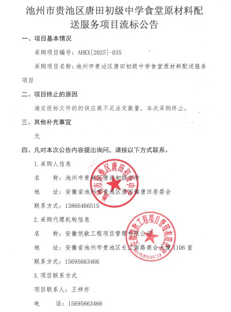 池州市貴池區(qū)唐田初級(jí)中學(xué)食堂原材料配送服務(wù)項(xiàng)目流標(biāo)公告