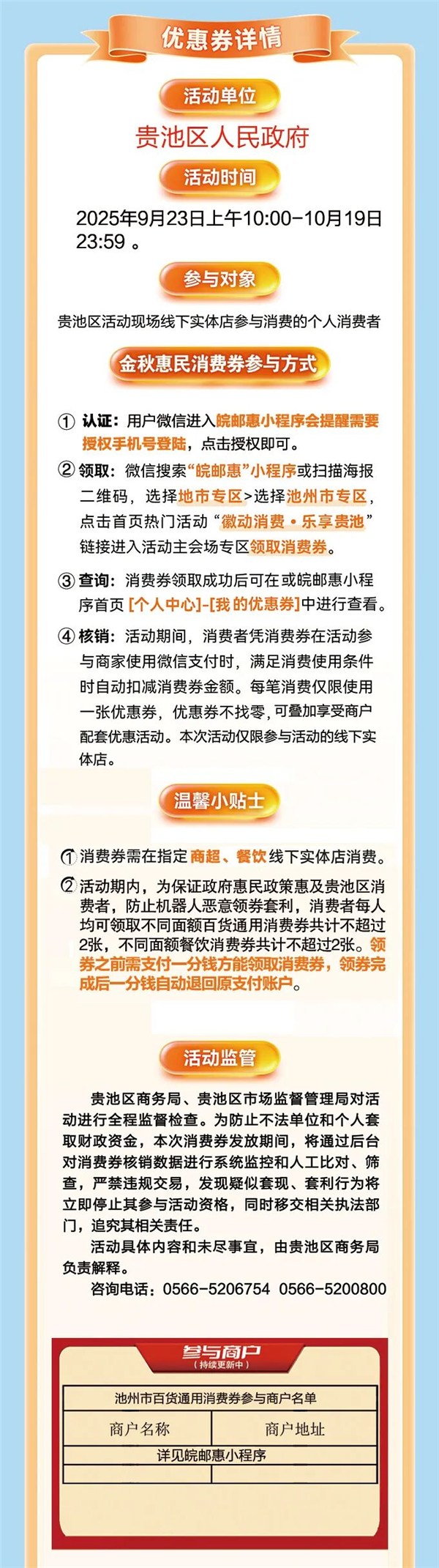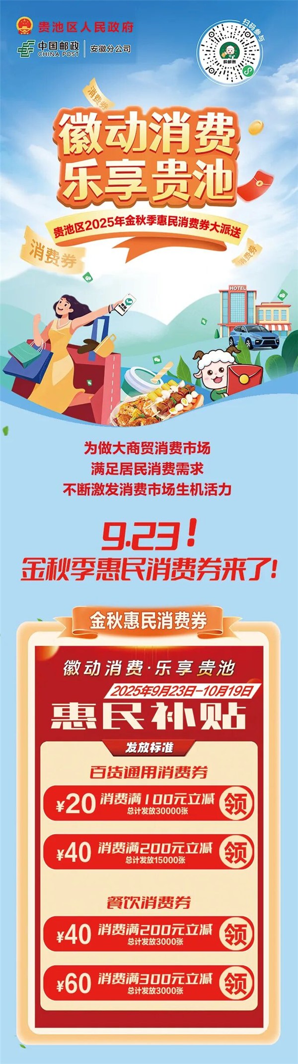 貴池將發(fā)放150萬元金秋季惠民消費券,9月23日10:00開搶,單筆消費最高減60元,買百貨、下館子都有優(yōu)惠,數(shù)量有限,先到先得哦!