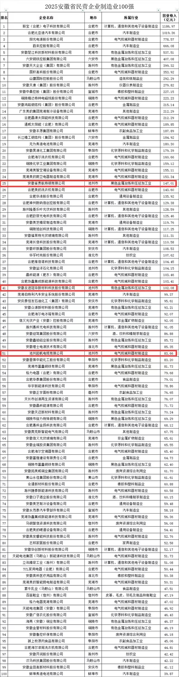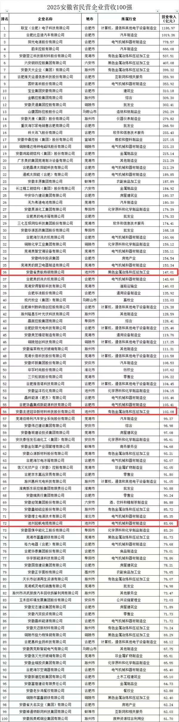 此外,10月16日上午,2025安徽省民營企業(yè)百強發(fā)布會在合肥舉行。會上發(fā)布了2025安徽省民營企業(yè)“營收百強”“制造業(yè)百強”“服務(wù)業(yè)百強”“吸納就業(yè)百強”榜單。其中,我區(qū)企業(yè)安徽省貴航特鋼有限公司、安徽友進冠華新材料科技股份有限公司、池州起帆電纜有限公司分別位列安徽民營企業(yè)營收百強榜第36、56、72名和安徽省民營企業(yè)制造業(yè)百強榜第25、41、51名;安徽省貴航特鋼有限公司、池州起帆電纜有限公司還分別位列安徽省民營企業(yè)吸納就業(yè)百強榜單第51位、62位;此外,池州市山邊廢舊物資回收有限公司位列安徽省民營企業(yè)服務(wù)業(yè)百強榜單第53位。