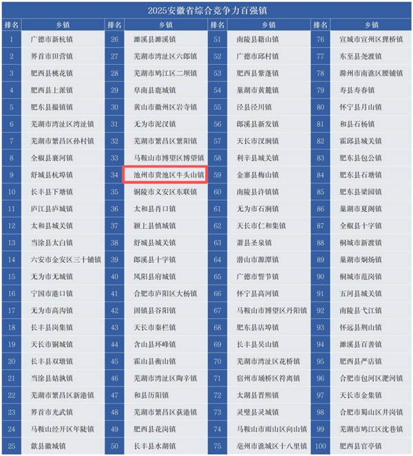 競爭力智庫、北京中新城市規(guī)劃設(shè)計研究院等機構(gòu)日前在北京聯(lián)合發(fā)布《安徽省鄉(xiāng)鎮(zhèn)綜合競爭力報告2025》(以下簡稱《報告》),揭曉了“2025安徽省綜合競爭力百強鎮(zhèn)”(簡稱2025安徽省百強鎮(zhèn))名單。其中,我區(qū)牛頭山鎮(zhèn)上榜,位列第34位。