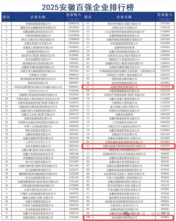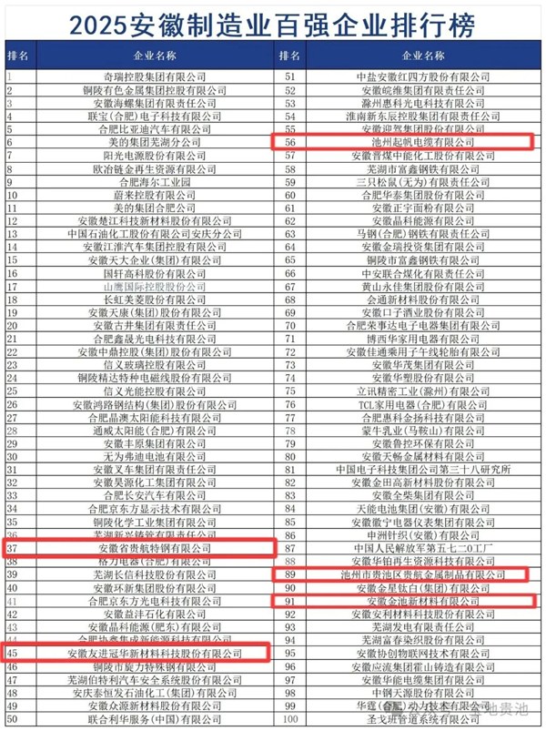 11月14日下午,2025年安徽省百強(qiáng)企業(yè)發(fā)布會暨企業(yè)家論壇在合肥舉行,會上發(fā)布了2025安徽百強(qiáng)企業(yè)系列榜單,貴池多家企業(yè)表現(xiàn)卓越,其中,貴航特鋼、友進(jìn)冠華、起帆電纜3家企業(yè)榮登百強(qiáng)企業(yè)榜單,分別位列第67、82、100位。大會同時發(fā)布了安徽省制造業(yè)百強(qiáng)榜單,我區(qū)貴航特鋼、友進(jìn)冠華、起帆電纜、貴航金屬、金池新材料5家企業(yè)分別居制造業(yè)百強(qiáng)第37、45、56、89、91位。