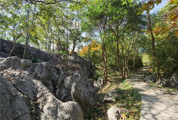 初冬之際登臨齊山,呼吸一下遠(yuǎn)離城市的純潔空氣。此時(shí)的齊山,色彩斑斕,沿著石階蜿蜒而上,摩崖石刻如時(shí)光書(shū)頁(yè)般點(diǎn)綴其間——最引人注目的當(dāng)屬包拯題寫(xiě)的“齊山”二字,筆力遒勁,其沉穩(wěn)剛健的字體恰似包公本人的京劇臉譜形象:大眼長(zhǎng)須,端正凜然,無(wú)聲訴說(shuō)著剛正不阿的千古風(fēng)骨。