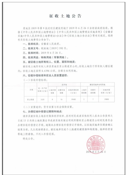 索引號: 11341802003285697X/201906-00043 組配分類: 征收土地信息