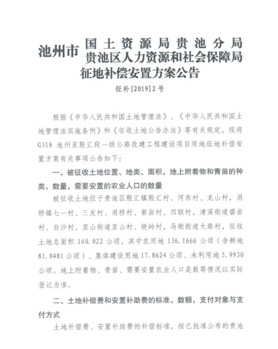 征地補償安置方案公告(318國道池州至殷匯段一級公路改建工程 )(里山街道)