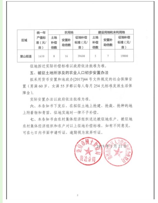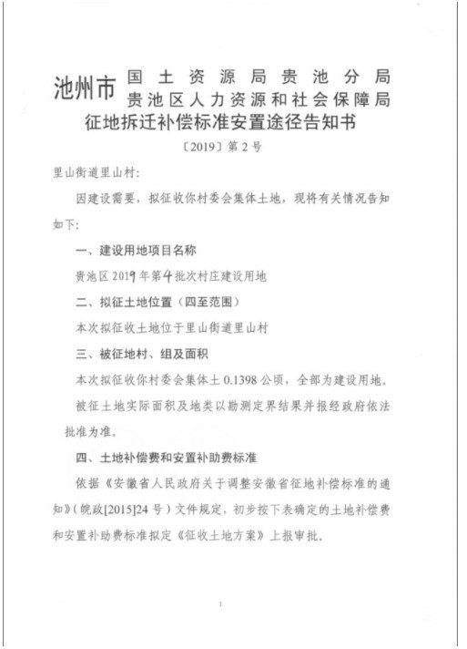 征地補(bǔ)償安置方案公告(2019年第4批次里山街道里山村)