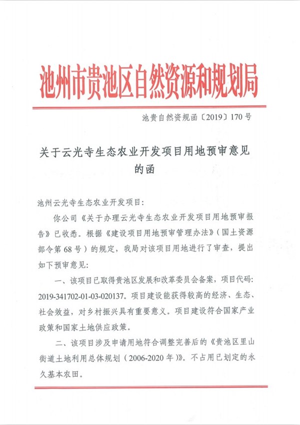 名稱: 關(guān)于云光寺生態(tài)農(nóng)業(yè)開發(fā)項目用地預(yù)審意見的函 文號: