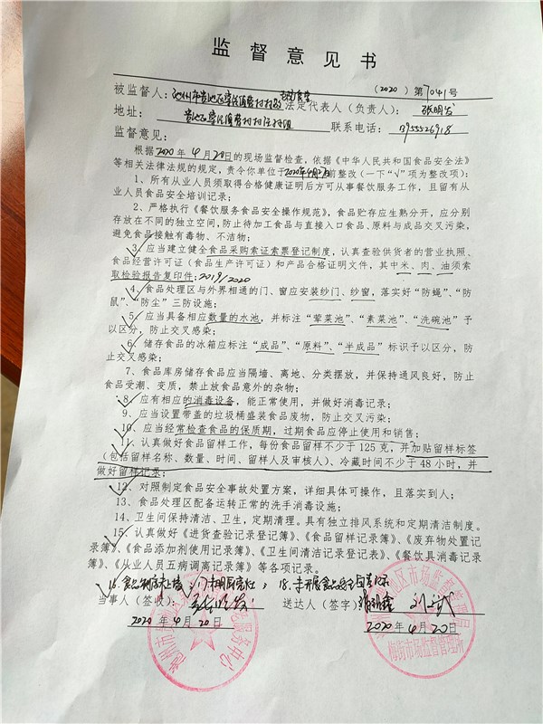 棠溪鎮(zhèn)曹村養(yǎng)老服務(wù)中心食品安全監(jiān)督意見書