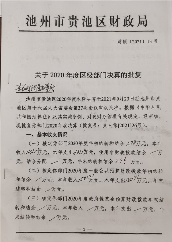 關(guān)于2020年度區(qū)級(jí)部門決算的批復(fù)