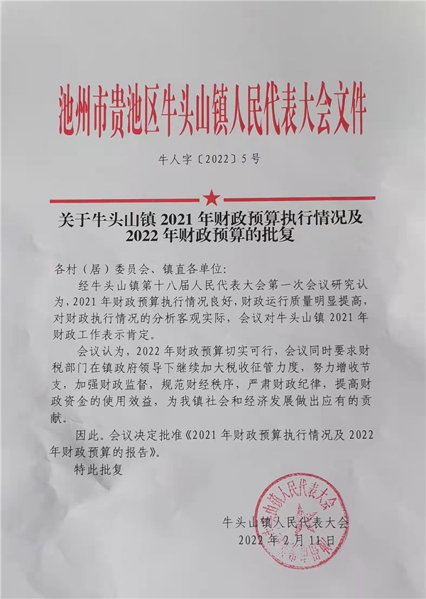 關(guān)于牛頭山鎮(zhèn)2021年財政預(yù)算執(zhí)行情況及2022年財政預(yù)算的批復(fù)