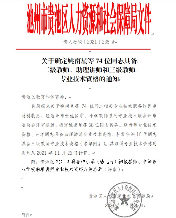 名稱: 關(guān)于確定姚南星等74位同志具備二級教師、助理講師和三級講師專業(yè)技術(shù)資格的通知 文號: